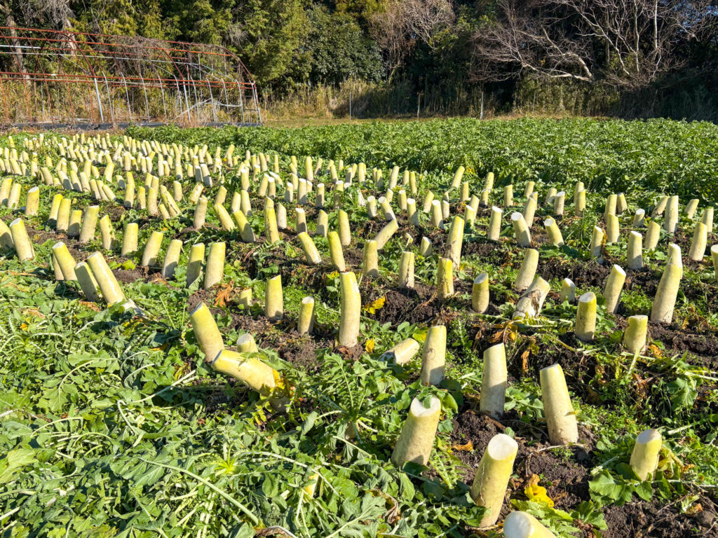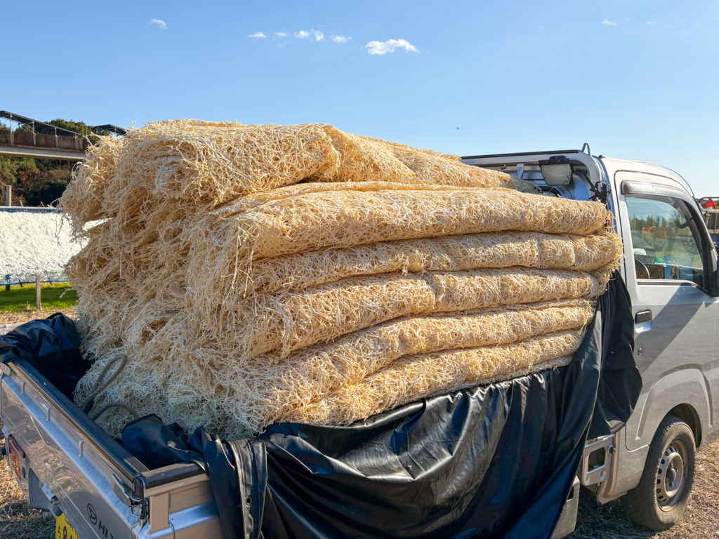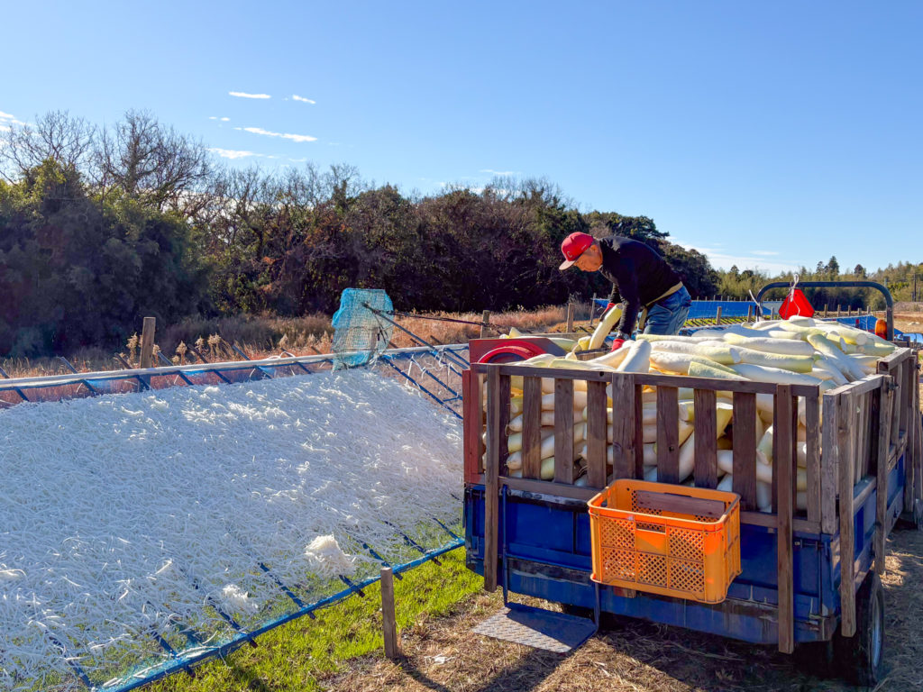 千切り大根は、大根づくりから始まり、収穫、洗浄、干し棚づくり、千切り・天日干し、巻き といった多くの工程があります。
