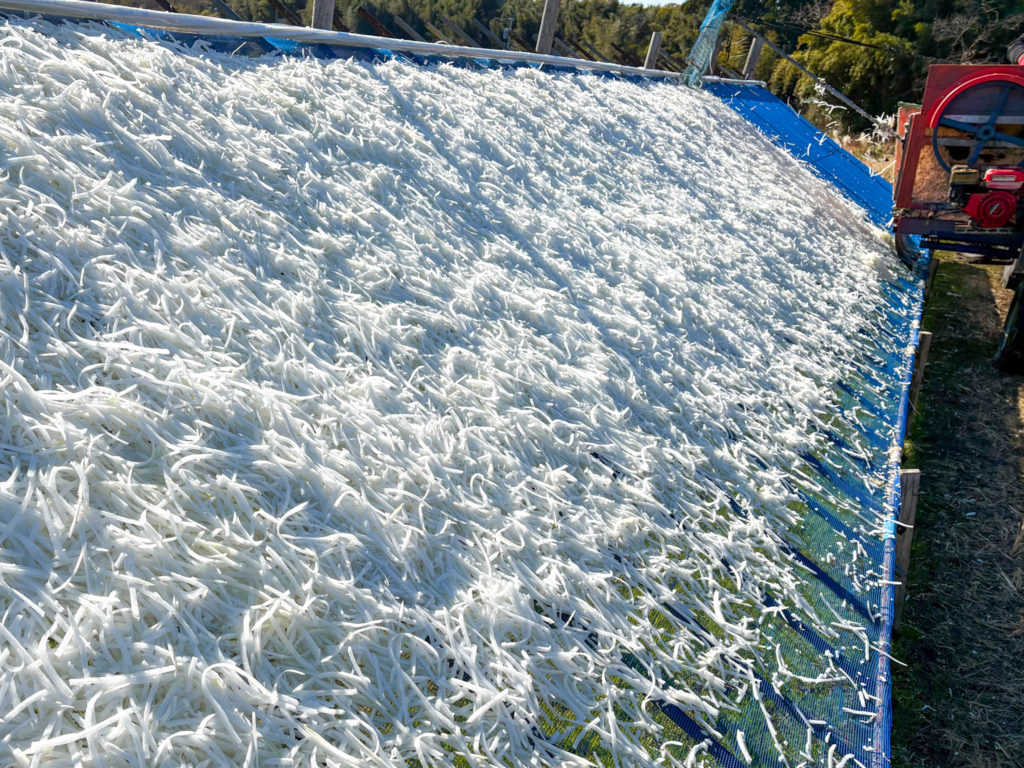 寒風にさらされ、時間をかけて仕上げられる千切り大根。