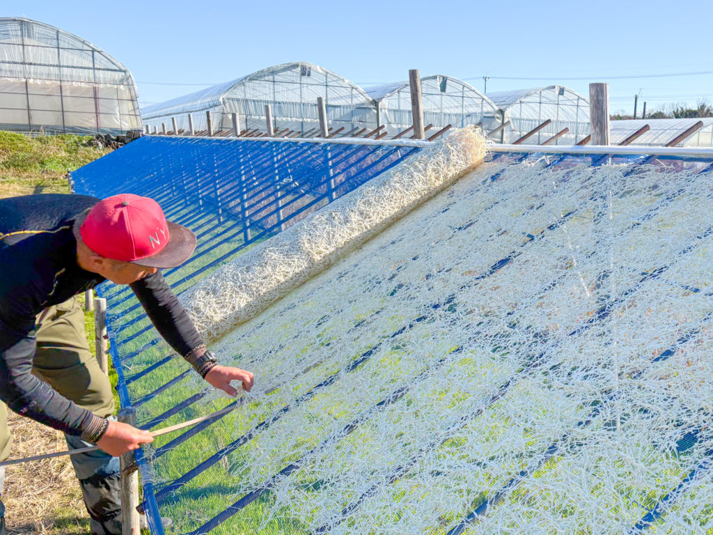 それでも、この棚があるからこそ、寒風にさらされたおいしい千切り大根が生まれます。 手間を惜しまない作業が、味につながっています。