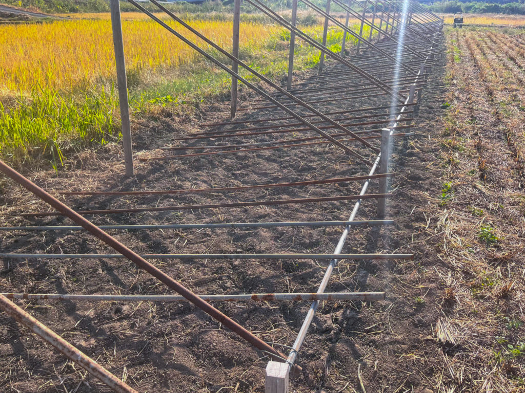トラクターで棚を立てる部分の地面をやわらかくし、支柱を立て、金具で固定。