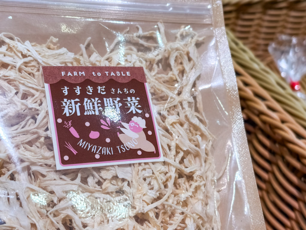 道の駅つの、Aコープ都農店、農協へ出荷し、自宅前の直売所(現在休止中)でも販売していて、インターネット販売サイト「ポケットマルシェ」でも千切り大根の注文を受けています。